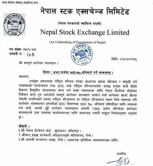 TMS account opening now requires a National Identity Card used for trading shares in Nepal. The decision has been made by Nepal Stock Exchange Limited (NEPSE).